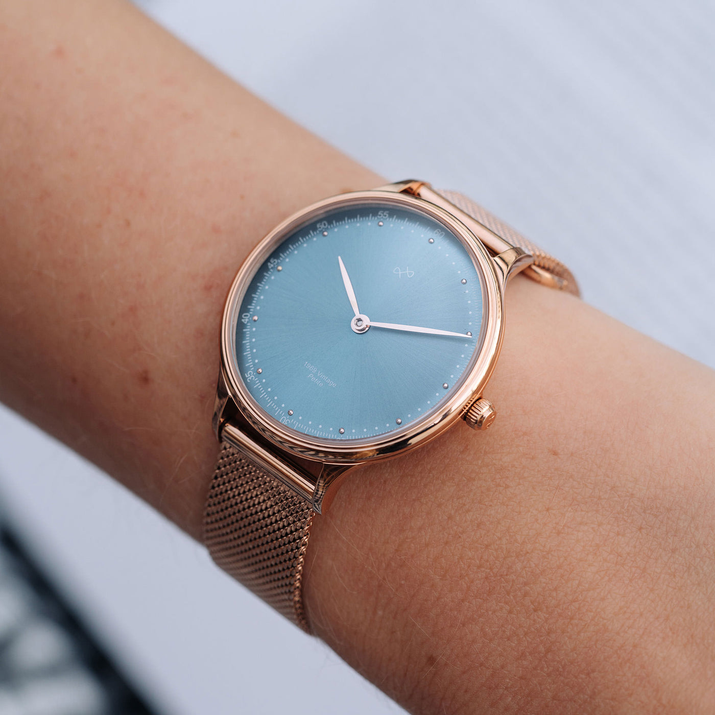 Our first women's collection is designed around such Quartz movement, together with vintage details in form of a slightly curved dial and a domed sapphire glass. Combining this with a ‘humble’ dream of creating yet another historical impact, we named this timepiece 1969 Vintage Petite.