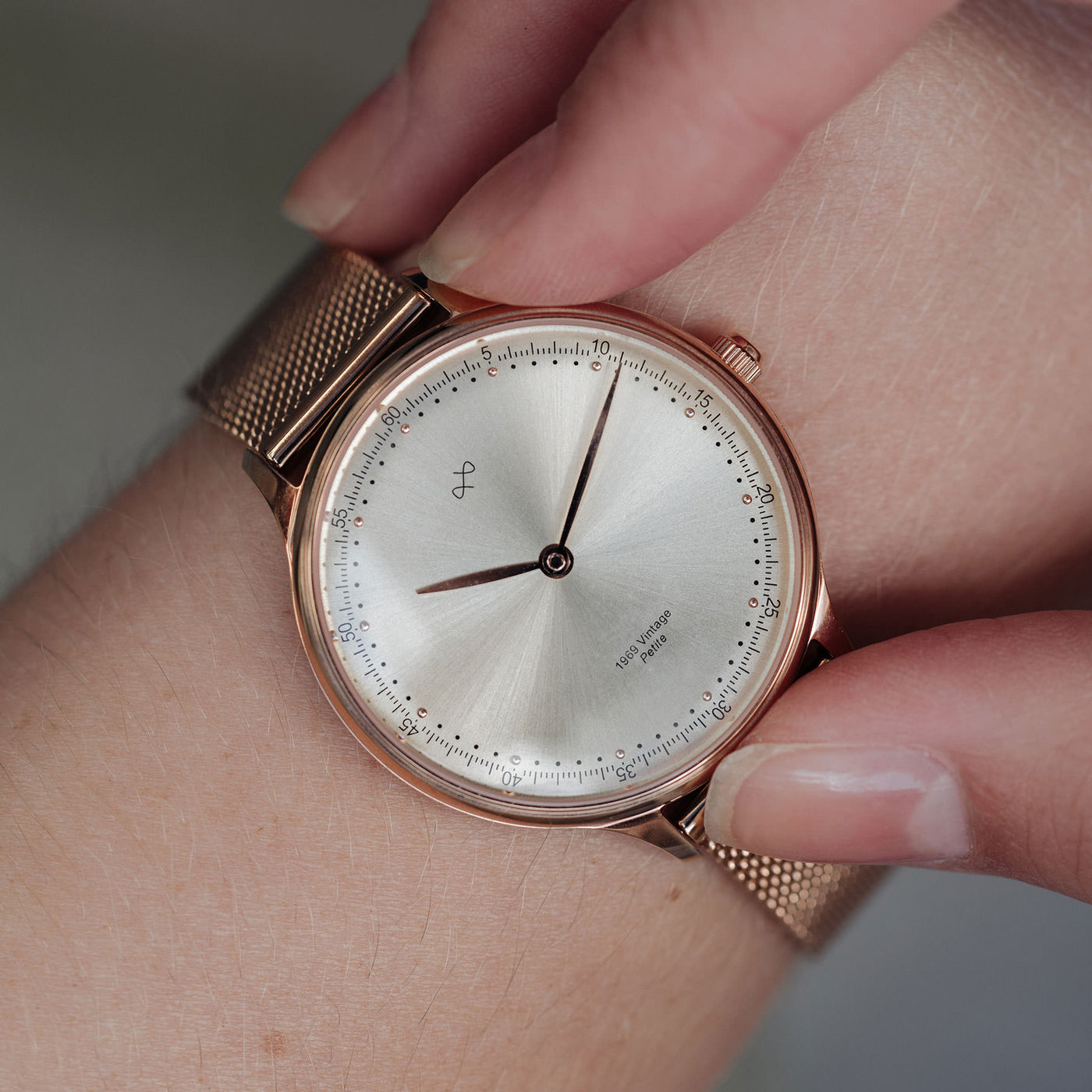Our first women's collection is designed around such Quartz movement, together with vintage details in form of a slightly curved dial and a domed sapphire glass. Combining this with a ‘humble’ dream of creating yet another historical impact, we named this timepiece 1969 Vintage Petite.