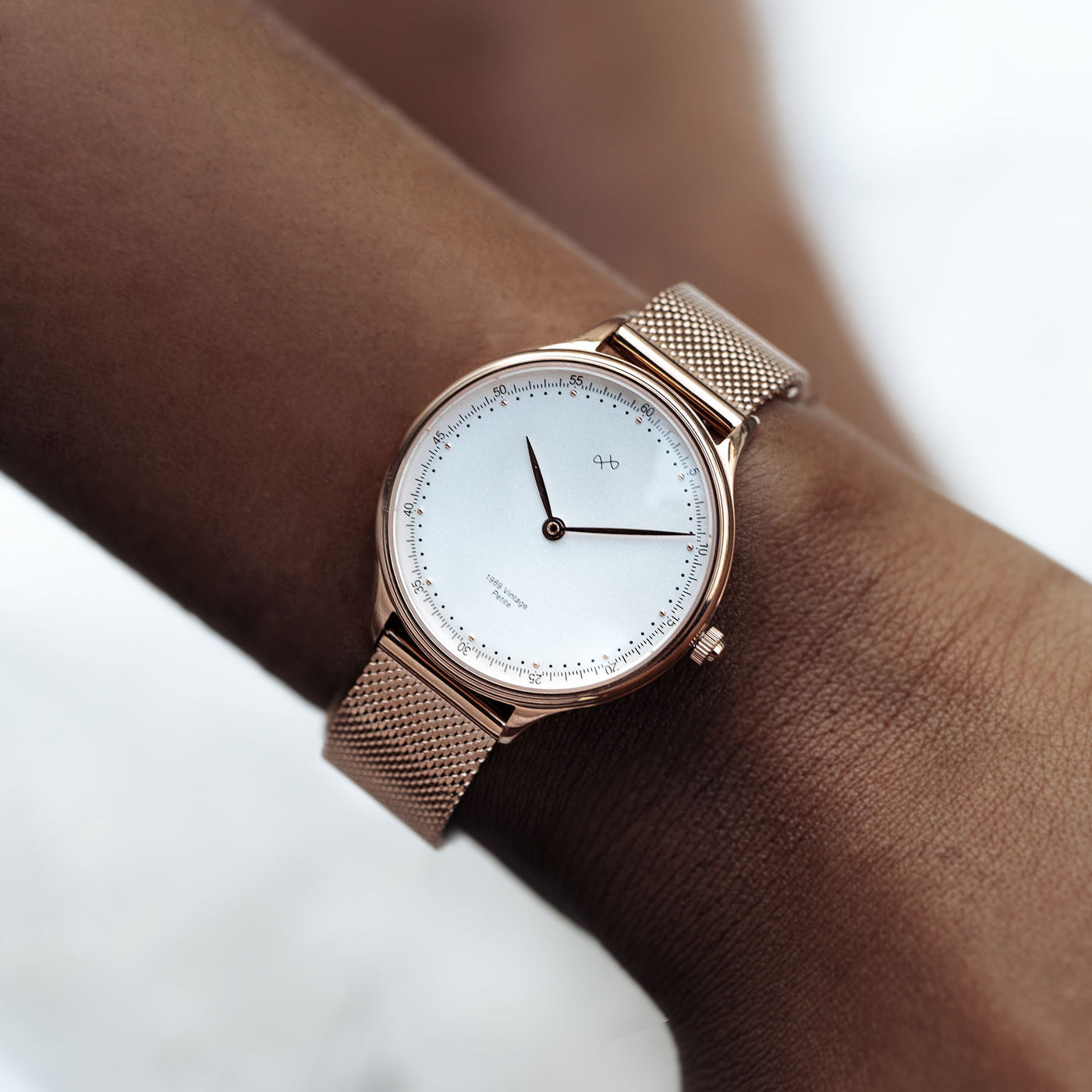Our first women's collection is designed around such Quartz movement, together with vintage details in form of a slightly curved dial and a domed sapphire glass. Combining this with a ‘humble’ dream of creating yet another historical impact, we named this timepiece 1969 Vintage Petite.