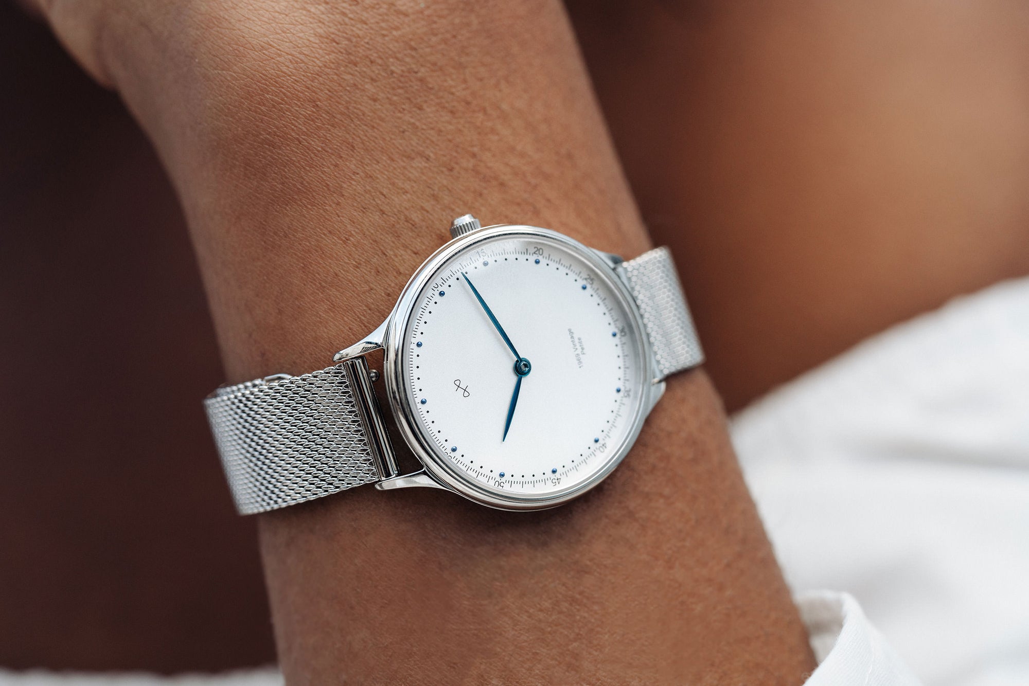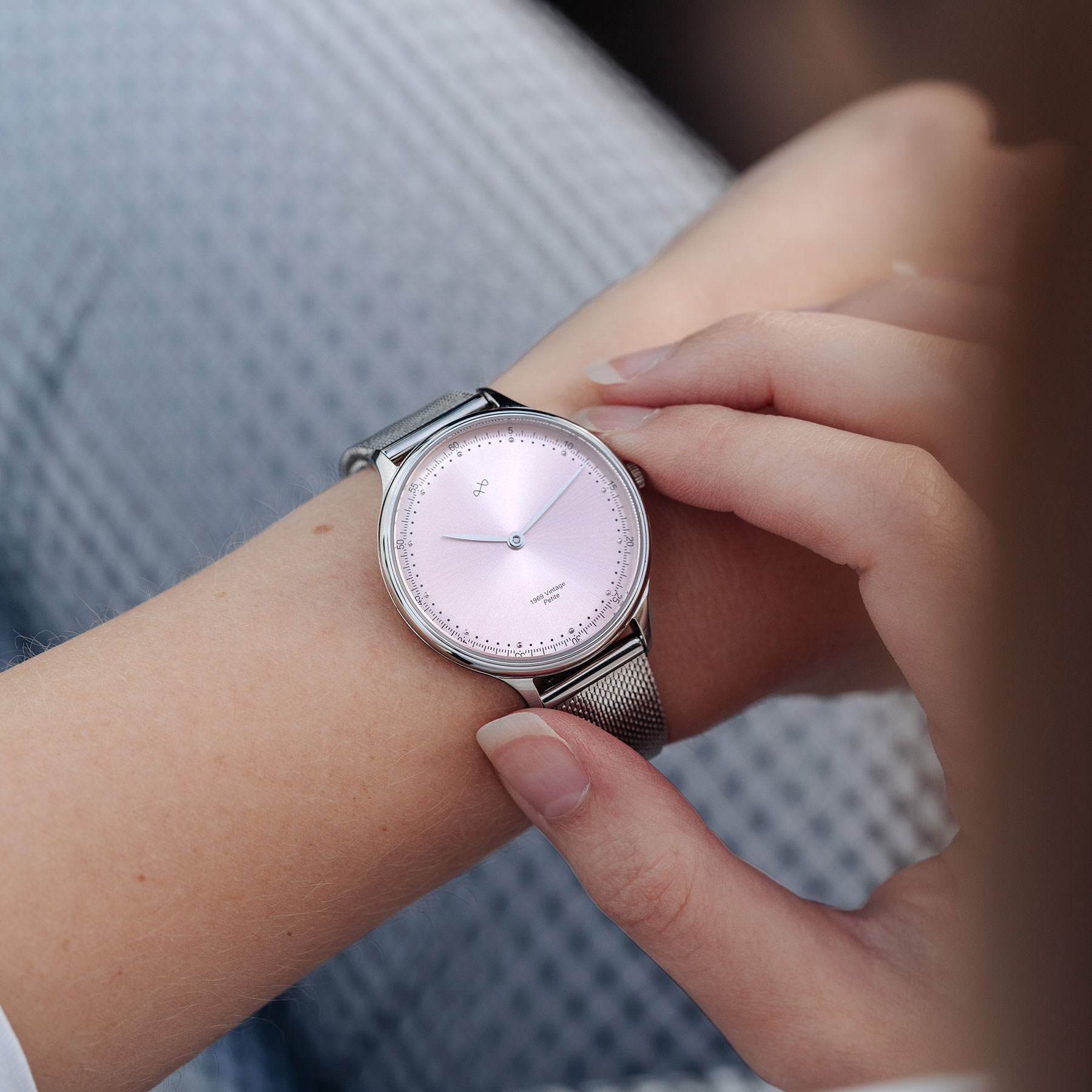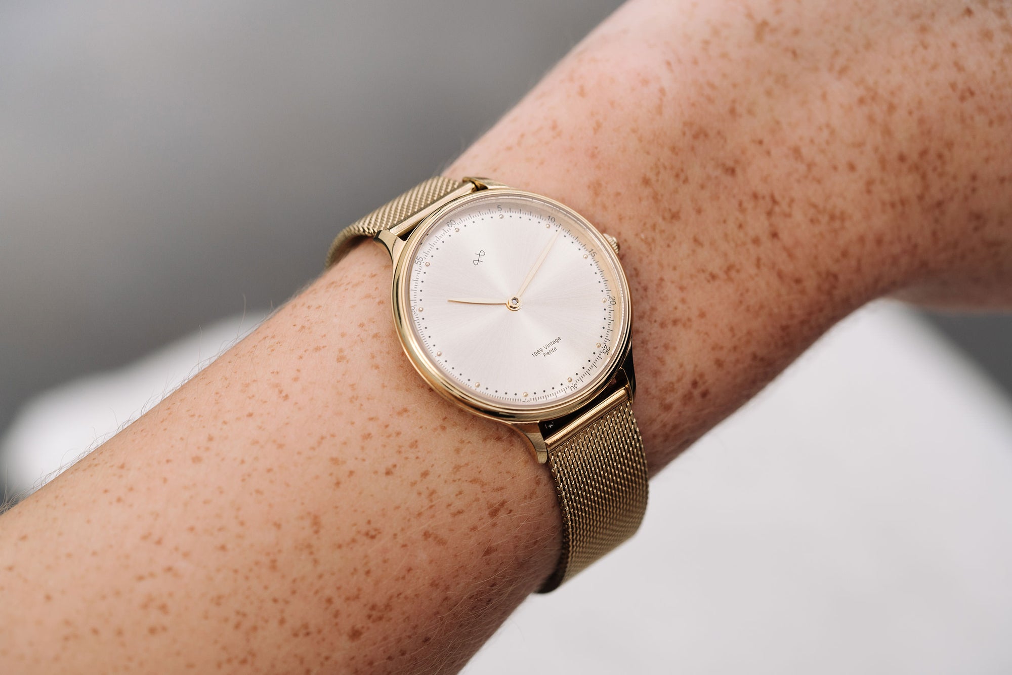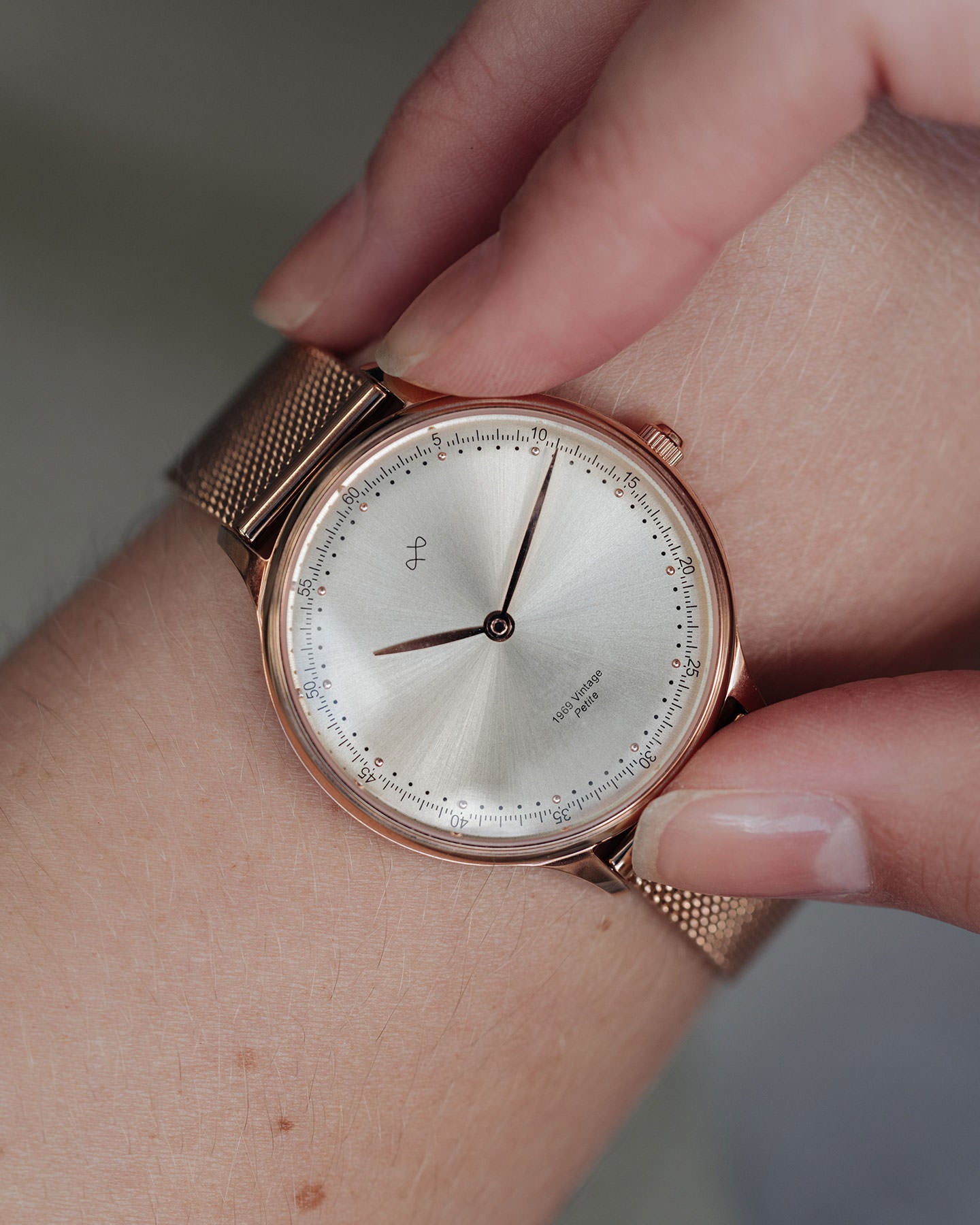 Our first women's collection is designed around such Quartz movement, together with vintage details in form of a slightly curved dial and a domed sapphire glass. Combining this with a ‘humble’ dream of creating yet another historical impact, we named this timepiece 1969 Vintage Petite.